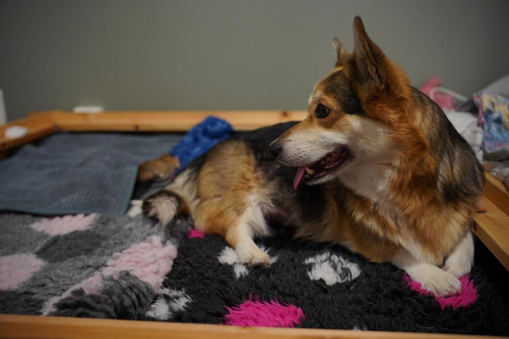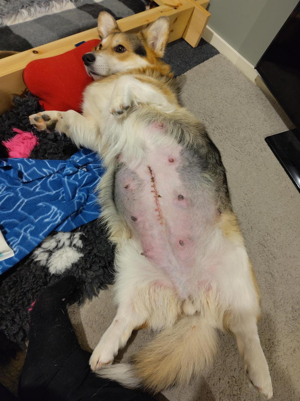 Jälleen tunti kului ja klo 20:00 tienoilla oli myönnyttävä ja lähdettävä kohti eläinlääkäriä tämän suosituksesta. Eläinlääkäri teki nopean sisätutkimuksen ja totesi pennun vetäytyneen takaisin päin kanavassa ja olevan tunnettavissa enää sormen päällä melko syvällä. Saimme itsellemme kaksi vaihtoehtoa; joko palaamme takaisin kotiin jatkamaan synnytystä ja Bella todennäköisesti voisi synnyttää luonnollisesti, mutta ensimmäisen pennun ennuste heikkenisi nopeasti ja lisäisi riskiä myös muiden pentujen menehtymiselle. Toinen vaihtoehto oli suorittaa sektio saman tien, kun eläinlääkärillä oli vielä hoitaja käytettävissä klinikalla, yöllä häntä ei olisi saatavilla. Eläinlääkärin suosituksesta valitsimme sektion turvallisempana vaihtoehtona ja niinpä Bella laitettiin unten maille tämän vielä voimakkaasti supistellessa viimeiseen saakka.