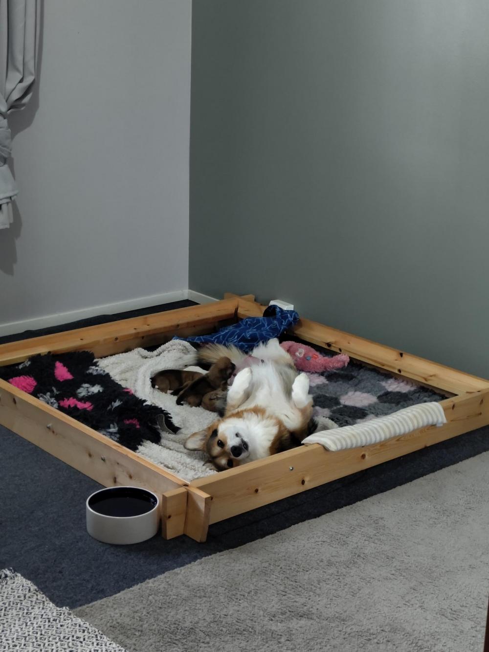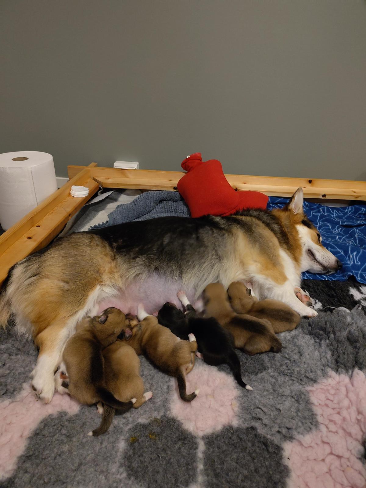 Pian papereiden kirjoittamisen jälkeen oli aika suunnata kotiin Bellan vielä ollessa aivan tokkurainen nukutuslääkkeistä, onneksi ajomatka kotiin ei ollut pitkä. Kotona toimimme ripeästi; Bella pentulaatikkoon kyljelleen, toinen asettamaan pentuja nisille ja toinen vahtimaan Bellaa, lämpöä pennuille. Pennut alkoivat imemään nisiä lähes saman tien lukuun ottamatta pentua, joka oli ollut pidempään synnytyskanavassa. Kyseistä pentua sai jatkuvasti asetella nisälle, eikä pentu ottanut kerrallaan kuin kulauksen tai pari ja alkoi hiipua pois heti jos sitä ei pitänyt hereillä. Jatkoimme kuitenkin sinnikkäästi hänen hereillä pitämistään, kunnes olimme varmoja hänen saaneen riittävästi maitoa vatsaansa. Onneksemme Bellalta tuli maitoa hyvin eikä maitoa erittävälle lääkitykselle ollut sektiosta huolimatta tarvetta. Puolen yön aikoihin kätilöksi sovittu kasvattaja pääsi perille ja auttoi pentujen ensimmäisen yön aikana kaikessa mahdollisessa ja saimme kaikki myös joitakin tunteja unta.