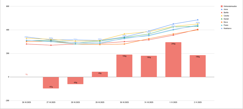 Bellan ja Ismon pennut täyttivät tänään viikon ja pienokaiset pääsivät jälleen emon valvovan silmän alla kuvattavaksi kotistudioon. Mikä valtava ero pentujen kehityksessä onkaan tapahtunut vain viikossa! Kasvojen piirteet ovat selkiytyneet, värit muuttuneet ja painot lisääntyneet (näistä vielä erillinen kaavio alla). Viikon edetessä pentujen ruokailuhetkistä on tullut tehokkaampia ja vatsat täyttyvät nopeasti täyteen, minkä jälkeen aikaa on jäänyt erikseen myös pidemmille unille ja Bella on päässyt sen ansiosta myös takaisin joihinkin arkisiin rutiineihin kotona.