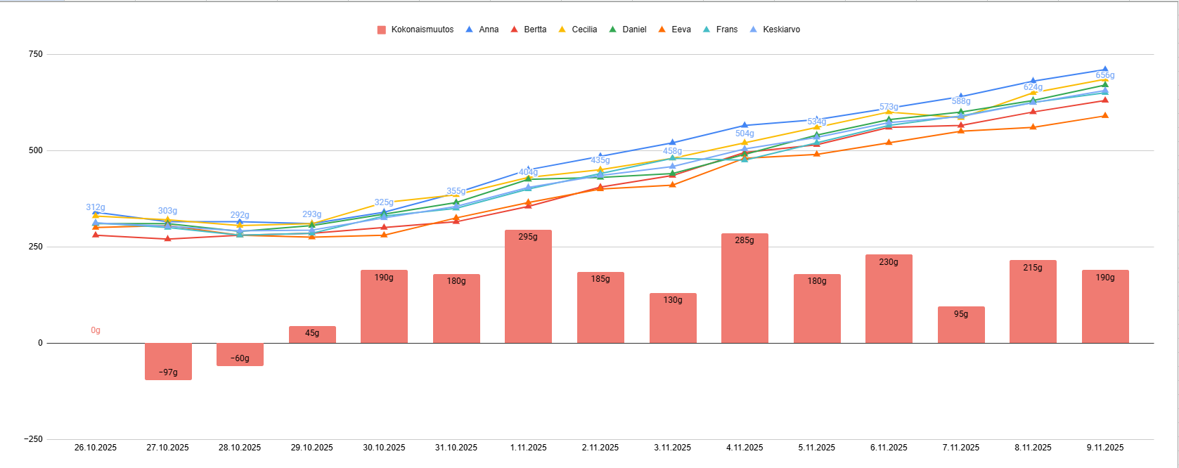 Kaikkien pentujen painot nousevat hyvää tahtia, painokisaa johtaa Anna ja perää pitää Eeva, painokäyrä alempana. Tulevalla viikolla silmät aukenevat pian, sillä viikkokuvien oton yhteydessä useamman silmät vaikuttivat hieman olevan raollaan. Jännittävä viikko siis tiedossa!
