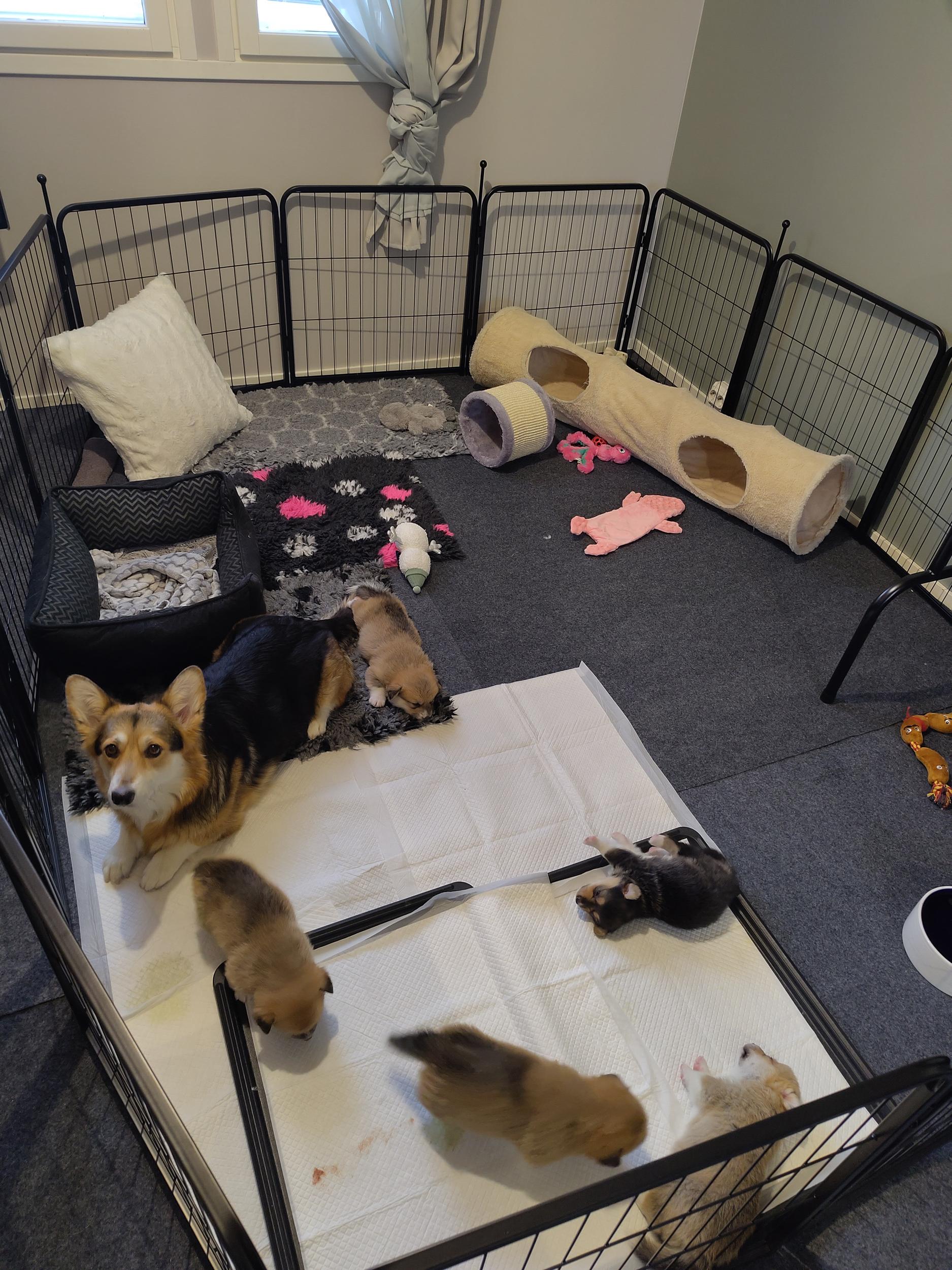 Pentujen neljännellä elinviikolla 17.11-23.11.2025 kiinteän ruoan määrää lisättiin hyvää tahtia, sillä Bella vieroitti pentuja imetyksestä nopeasti. Pennut pääsivät tutustumaan talon muihin tiloihin, imuriin, asuteisiin yms. ja vaativat jo paljon enemmän aktivointia uusien asioiden ja leikin muodossa. Pentujen liikkuminen lisääntyi hurjaa vauhtia, ja kun pennut eivät olleet viettäneet enää useaan päivään aikaa pentulaatikossa ja pysyivät hädin tuskin enää pentuhuoneessa, oli aika purkaa ja varastoida Fredun tekemä pentulaatikko. Pentuhuoneeseen kasattiin pentuaitaus, joka sisustettiin kosteudenpitävällä pentumatolla, pehmusteilla, leluilla, tasapainotyynyllä, kissan putkilla ja kuljetuslaatikolla totuttelua varten.