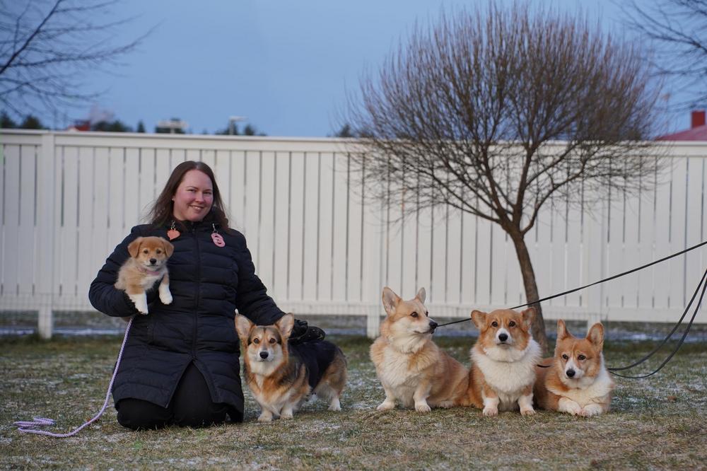 Pentujen uudet kodit sijaitsivat ympäri Suomea, mutta muutama pennuista jäi suhteellisen lähelle Kuopioon ja Varkauteen. Pennuista Eeva lähti Kuopioon pentueen emän Bellan kasvattaja Heli Kinnuselle kennel Crownwishin porukan joukkoon. Eevan noudon yhteydessä tarjoutui mahdollisuus napata myös kuva minusta kasvattajasta viiden sukupolven koirien kanssa, kiitos Helille, joka toi sukulaisia vierailulle Joensuuhun! Nyt oli aika siivota koti ja valmistautua joulun viettoon palautumaan hektisestä pentuajasta ja nukkumaan pois kertyneitä univelkoja.